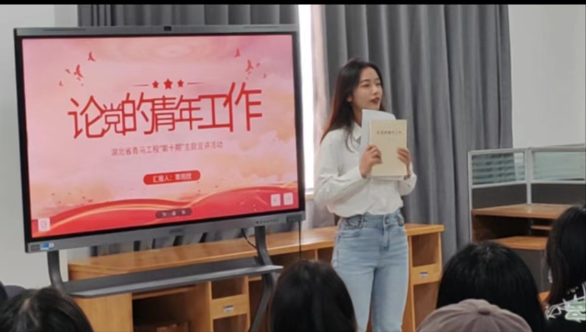 11月14日,湖北省“青马工程”第十期学员、2021级本科生覃雨欣作“论党的青年工作”主题宣讲。覃雨欣通过PPT讲解、播放视频等形式,让大家更深刻地理解习近平总书记围绕党的青年工作发表的一系列重要论述,并呼吁大家要牢记习近平总书记的殷殷嘱托,志存高远,脚踏实地,以奋斗者的姿态和实干者的状态书写好无愧于自己的青春篇章。